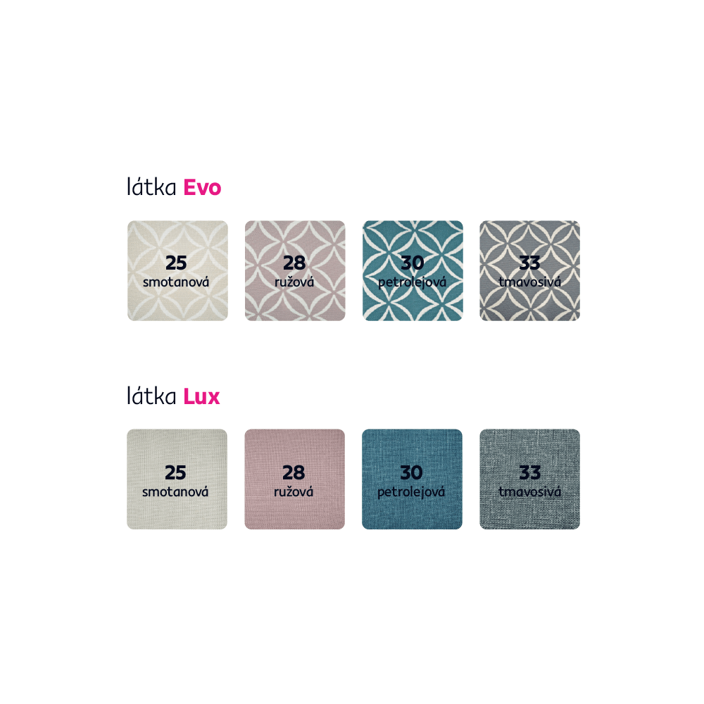 Vyberajte zo 4 farieb látky LUX a 4 farebných vzorov látky EVO podľa vzorkovníka. Jednofarebné kreslo alebo kreslo v kombinácii farieb a vzorov vám dodáme v dodacej lehote 8-10 týždňov. Taktiež si môžete vybrať z dvoch farebných prevedení nožičiek: drevo v prírodnom odtieni buk alebo drevo s čiernou povrchovou úpravou. Pri individuálnej objednávke je potrebné zaplatiť 20% zálohu z danej sumy. Po uhradení zálohy bude Vaša požiadavka zadaná do výroby.